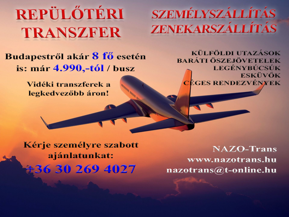 Bel- és külföldi repülőtéri transzfereket, illetve utazásokat is vállalunk.